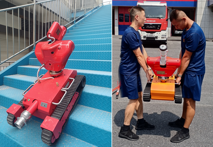 The light weight robot (70Kg)allows 2 human fire fighters to carry to fire scenes, making it faster todeploy to a fire site and faster to retrieve later from the scene.